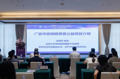 图:广安宫颈癌筛查公益项目启动会现场,北京大学深圳医院国家子宫颈癌早诊早治示范基地主任、妇产科学研究所所长吴瑞芳教授做项目介绍