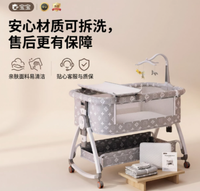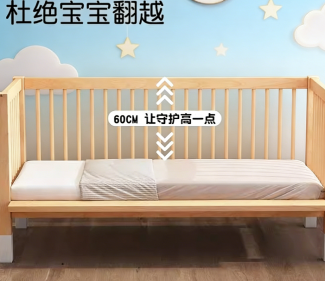 该产品主打高性价比,精准契合普通新生儿家庭的核心需求,以天然安全、实用便捷为核心卖点。整床采用优质实木打造,无漆无胶,无甲醛残留,自带天然木香,完美适配宝宝口欲敏感期;做工精细无毛刺,配备脚轮且赠送蚊帐,支持与大床拼接,采用成长型设计,可转换为儿童床,有效避免产品闲置。