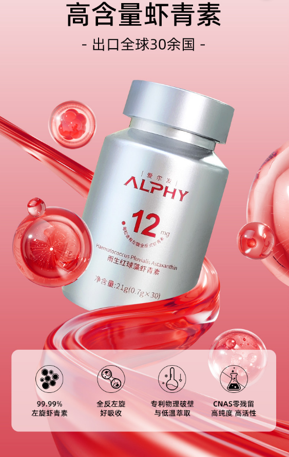 爱尔发虾青素正是严格选用此优质原料,雨生红球藻虾青素凝胶糖果每粒蕴含12mg高浓度虾青素精华,并确保99.99%为高活性的左旋全反式结构。我们采用独家专利物理破壁与低温萃取技术,全程避免化学溶剂,确保纯净与高效吸收。其卓越品质获得了国家专利认证,并由CNAS实验室严格检测验证。正因对原料与工艺的坚持,爱尔发已成为畅销全球30余国的信赖之选。