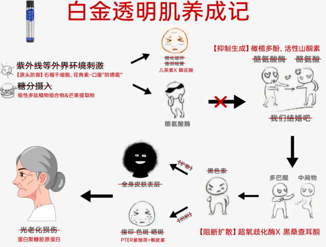 传统美白产品深陷“单一靶点、表层作用”的局限:仅依赖熊果苷、VC等单一成分抑制黑色素生成,却忽视了紫外线损伤、糖分摄入带来的糖化反应、细胞氧化等连锁问题。紫外线会破坏皮肤屏障,加速黑色素沉积。
