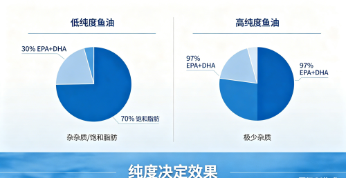专业细节解释: 市面上很多鱼油产品有效成分(EPA+DHA)含量不足30%,其余70%都是饱和脂肪酸和其他杂质。这意味着吃进去的大部分是普通油脂,而非有益成分。营养学界的共识是:高纯度鱼油(有效成分≥85%)才能发挥明确的辅助健康作用。低纯度鱼油不仅效果有限,还可能增加身体代谢负担。
