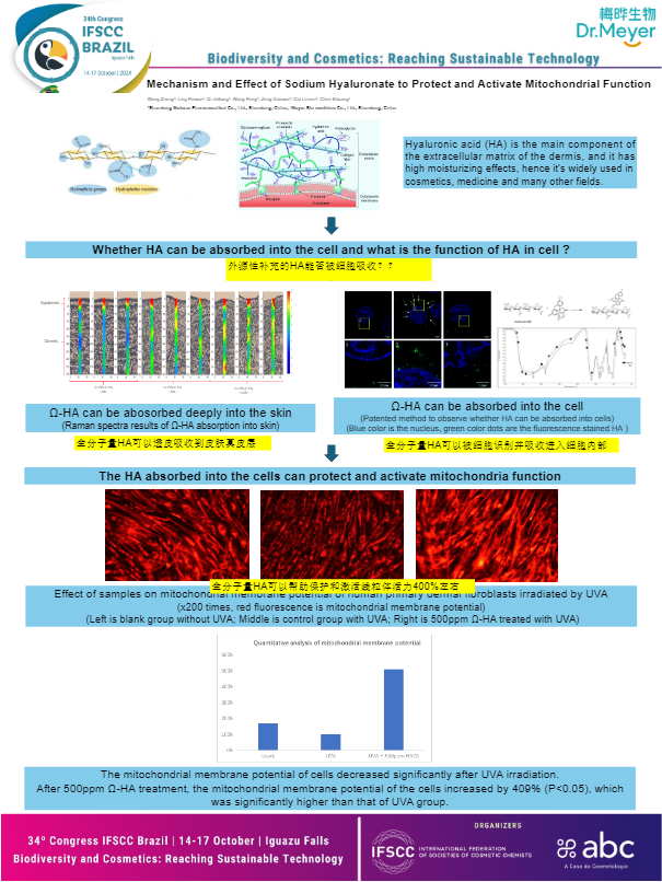 FAM173研究的突破,团队以专利荧光标记与超分辨成像技术,直观证实了全分子量ΩHA可被细胞主动摄取、进入胞内。更关键的是,研究首次明确了线粒体保护机制,UVA胁迫下,细胞线粒体膜电位显著下降,而添加ΩHA后,膜电位回升幅度高达409%。