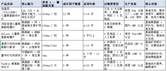 作用机制:赖氨酸辅助支持生长发育,骨胶原蛋白肽补充骨骼基质,氨基丁酸辅助调节睡眠,钙与维生素 D 促进钙吸收,可实现基础生长与睡眠调节,无 12 种生长因子协同作用,无法高效激活内源性生长因子与骨骼细胞活性。